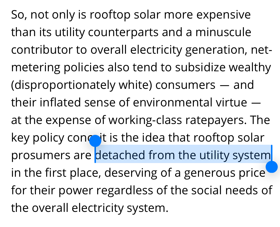 The entire idea of 'behind the meter' implies rooftop solar is detached from the utility system and its larger socialized cost and public service model. 10/x