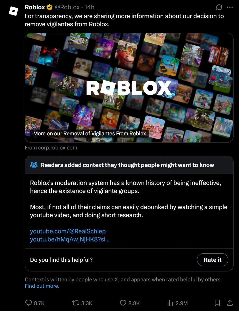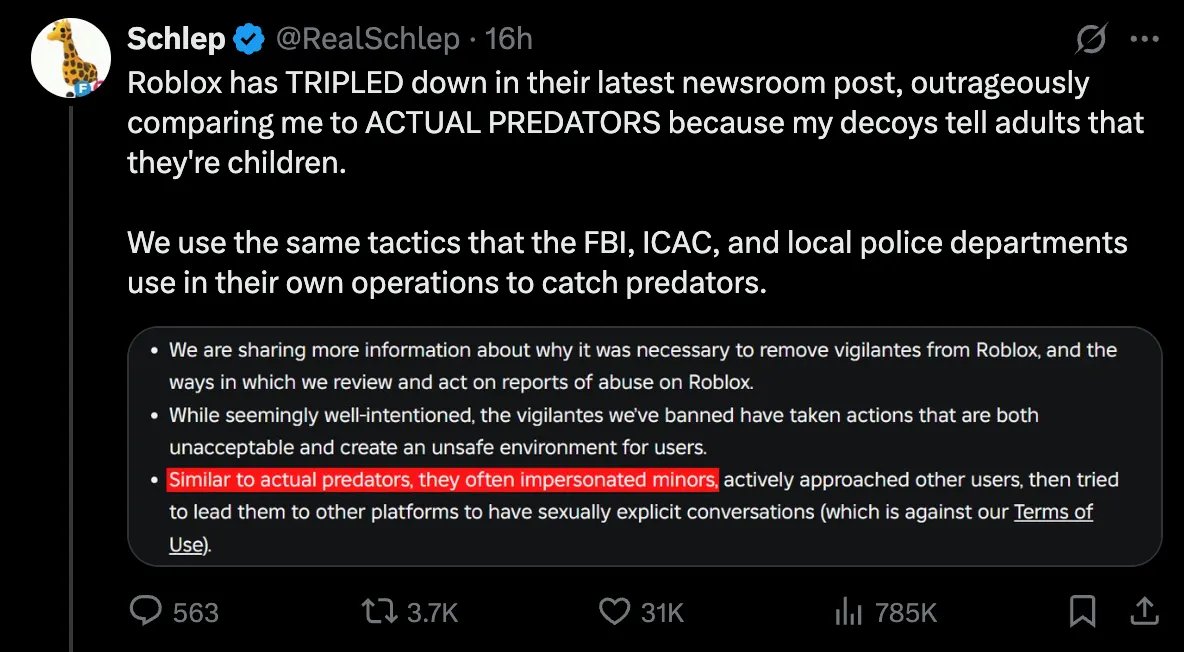 “History has proven again and again [that] it’s infinitely easier for corporations to silence and censor whistleblowers than actually work on fixing whatever issue they're bringing attention to. Roblox doesn't have a child predator issue if no one's able to report on it. The fact [that] his [Schlep’s] investigations led to six actual arrests made by the police acting on outside evidence is proof enough his efforts aren't misguided.”