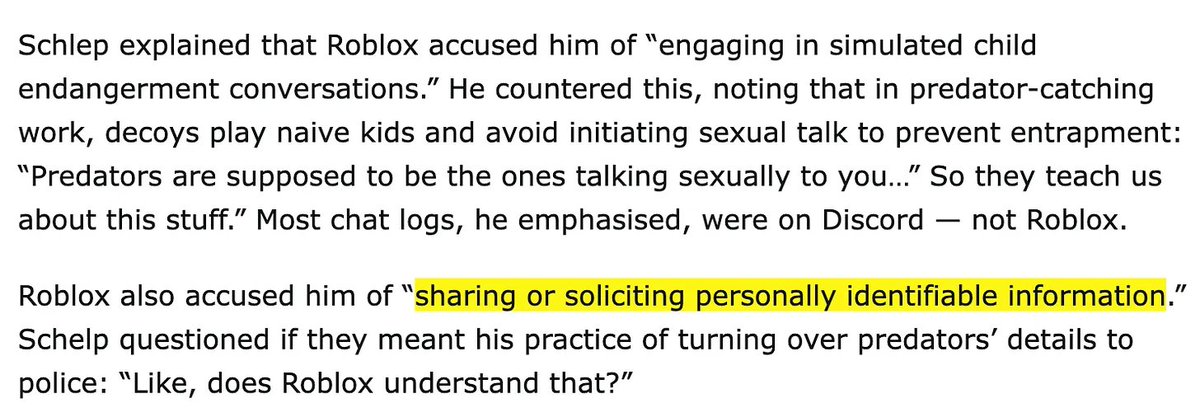 Schlep was gobsmacked and wondered if Roblox was referring to the practice of turning over the information of predators to police.