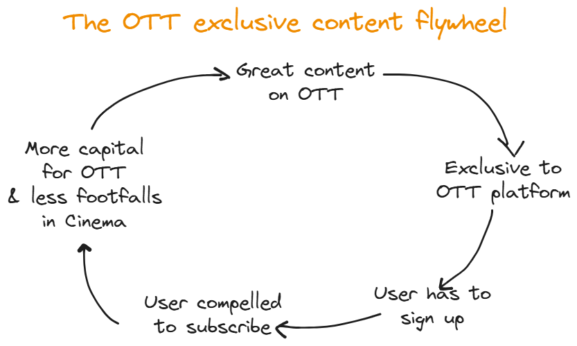 The content flywheel explains why owning exclusive content now ensures you & I don’t step out of the house to watch a movie - because exclusive content is on our phones via OTTs!