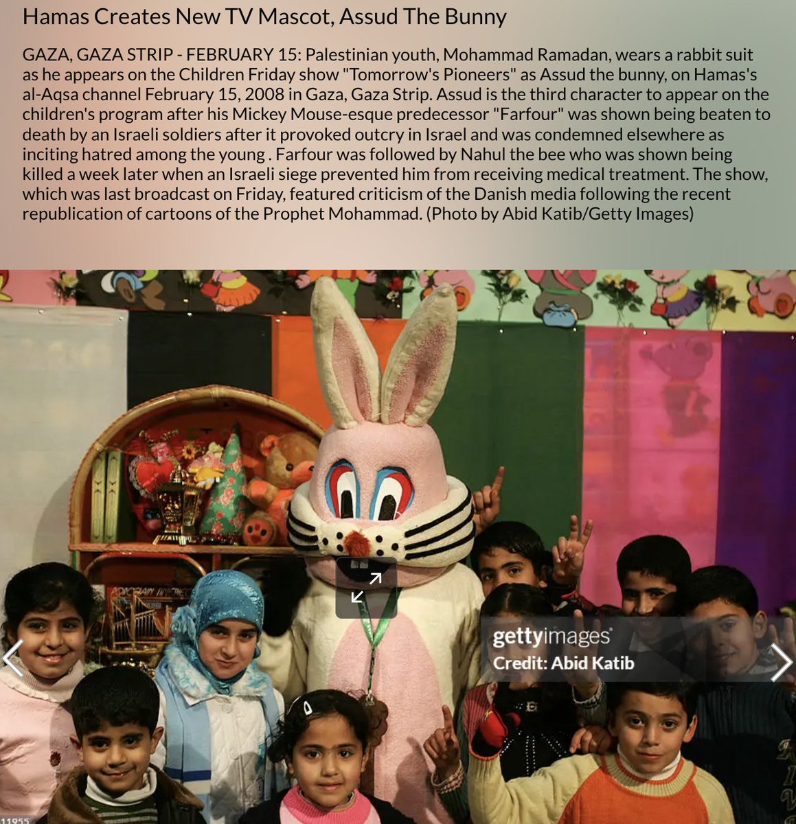 This was just one episode of Tomorrow's Pioneers. Many of its episodes echoed similar sentiments, including a bunny mascot that declared "I, Assud, will get rid of the Jews, and I will eat them up, Allah willing!"