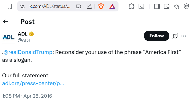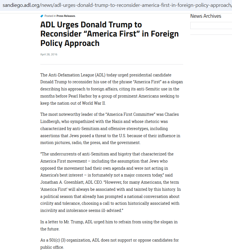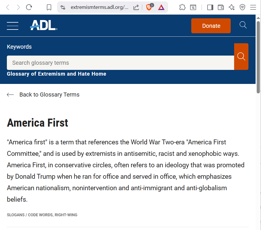 "AMERICA FIRST" IN @ADL GLOSSARY OF EXTREMISM & HATE