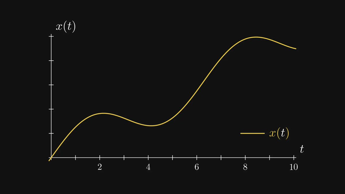 Suppose that the position of an object at time t is given by the function x(t), and for simplicity, assume that it is moving along a straight line — as the distance-time plot illustrates below.