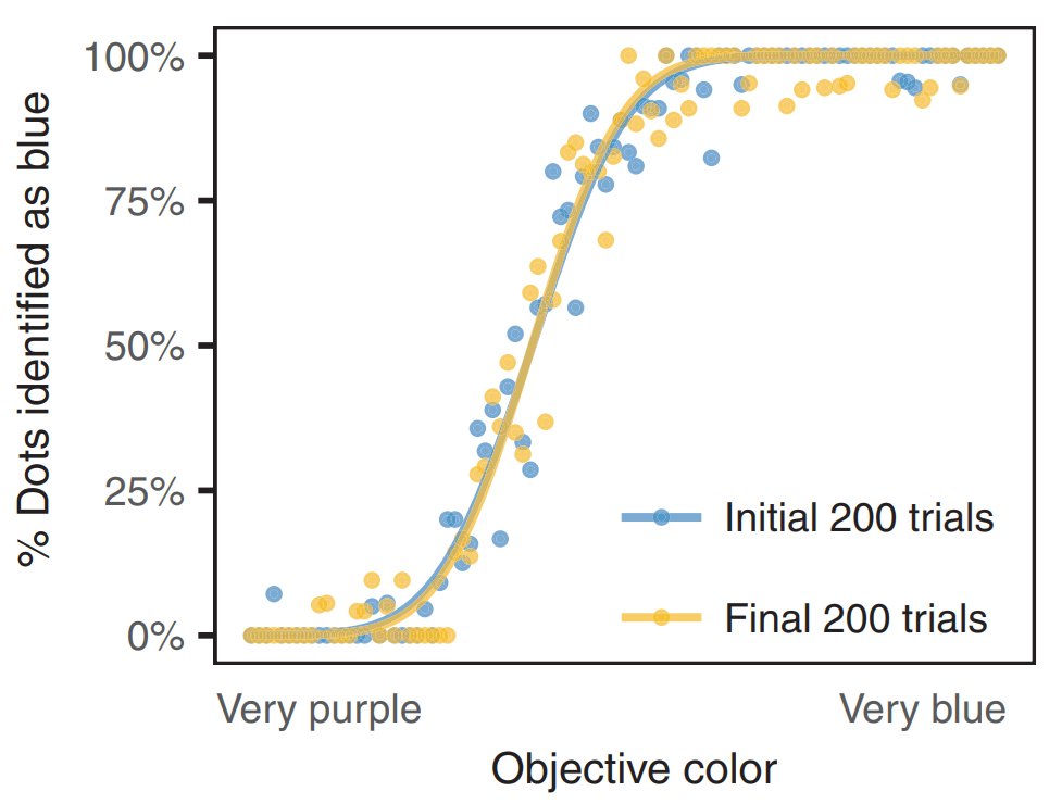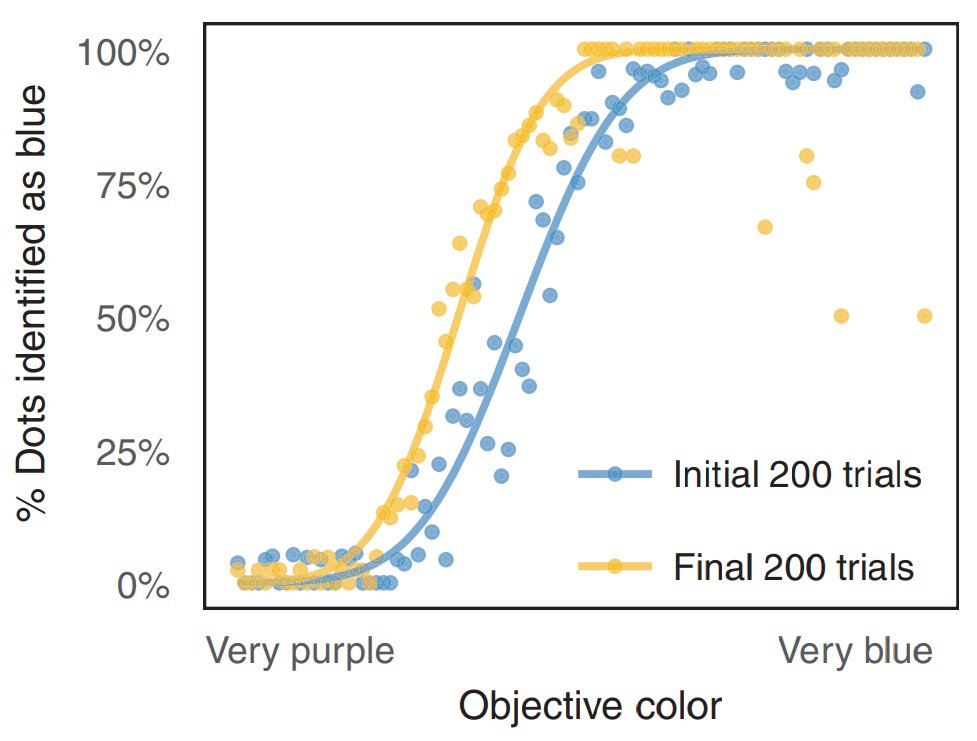 Notice what happened? People started seeing dots which they would've previously identified as purple as being blue instead.