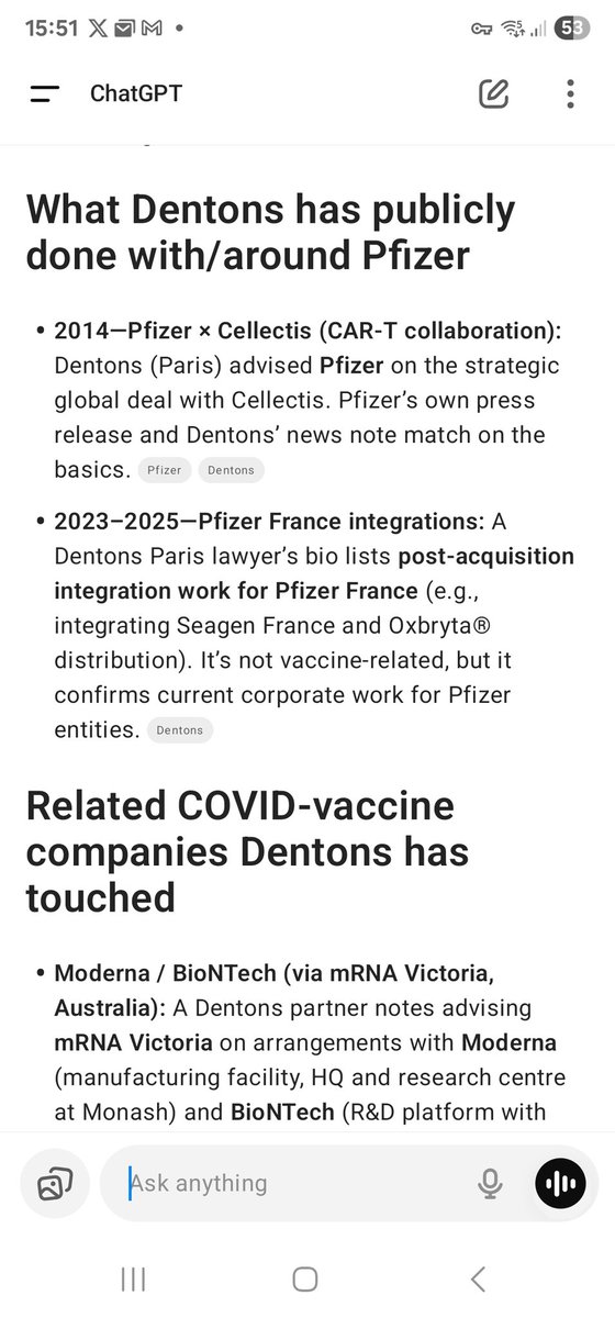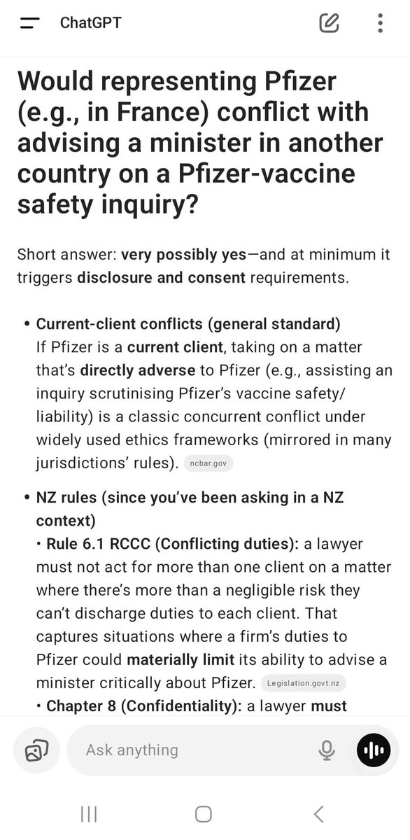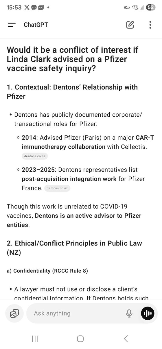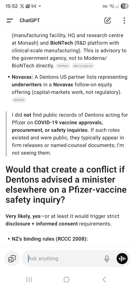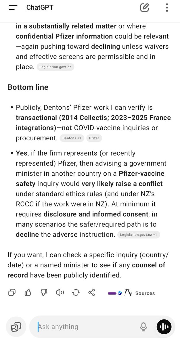 Then we need to ask the question....if Dentons Legal is working FOR PFIZER anywhere in the world, does it present a conflict of interest for them to provide legal advice to New Zealand key respondents in the NZ Royal Commission of Inquiry.....given that the very questions they would be asked on the public stand pertain to SAFETY AND EFFICACY OF THE PFIZER VACCINE