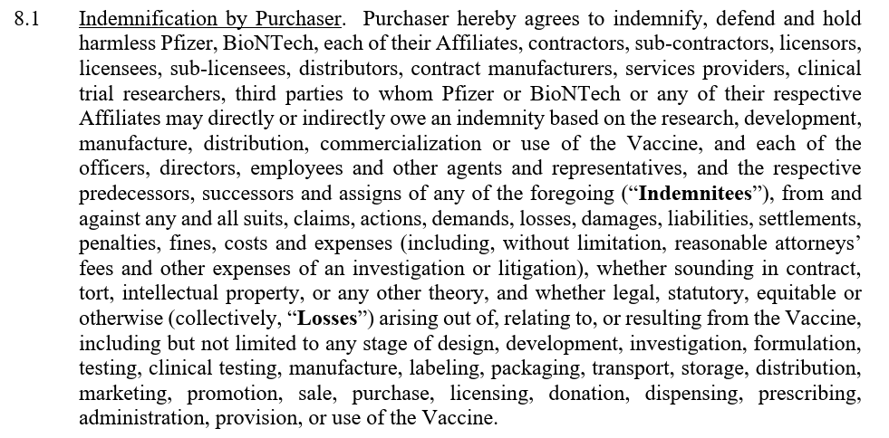 This states that the purchaser (the NZ Government) agrees to INDEMNIFY DEFEND AND HOLD HARMLESS Pfizer and their partner BioNTech