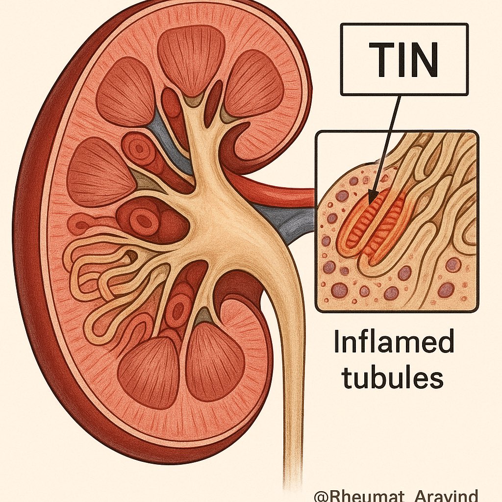 4/ The most frequent kidney problem in Sjögren’s is tubulointerstitial nephritis (TIN)—inflammation and scarring around tiny kidney tubes—leading to impaired kidney function.