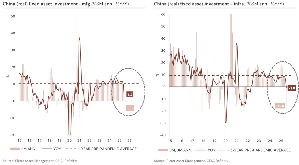 Manufacturing remains positive y/y (+3.9%) but is falling ~6% on a 6-month basis; infrastructure has plunged (-16% 6m ann.).