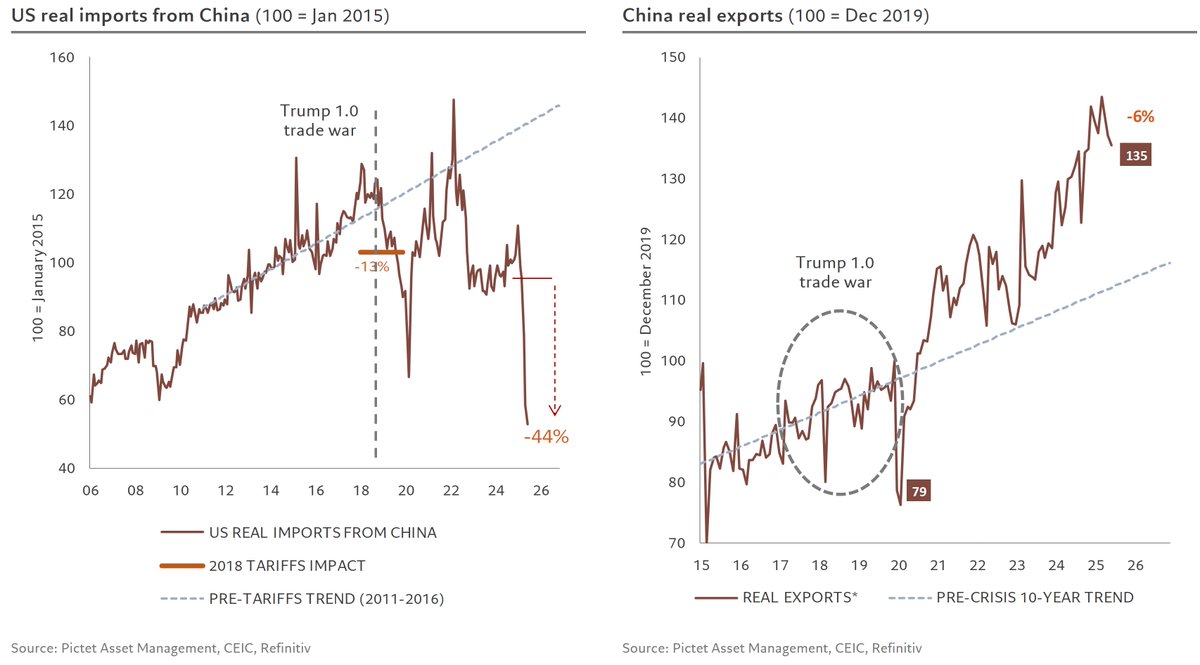 10/ In volume terms (June data), exports to the US have dropped ~44% since March, pulling total Chinese exports down 6% over the same period. This decline is entirely due to the US (13% of China’s exports); shipments to the rest of the world remain flat, yet at high levels