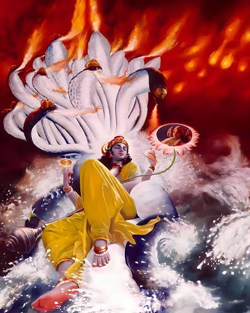 Fire from Sesha Naga, storms, and cosmic floods engulf existence.
