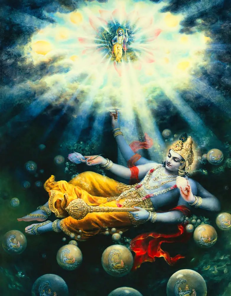 👉 Earth, planets, galaxies, devas, asuras, even time itself → all merge back into Maha-Prakriti (Primordial Nature).