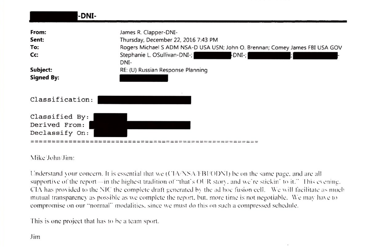 First, then-National Security Agency Director Mike Rogers sent a Dec. 2016 email to then-DNI James Clapper on the 2017 Intelligence Community Assessment on Russia.