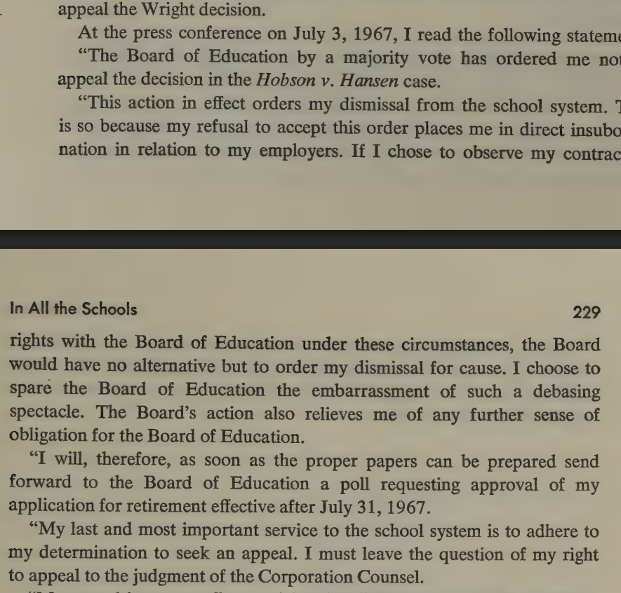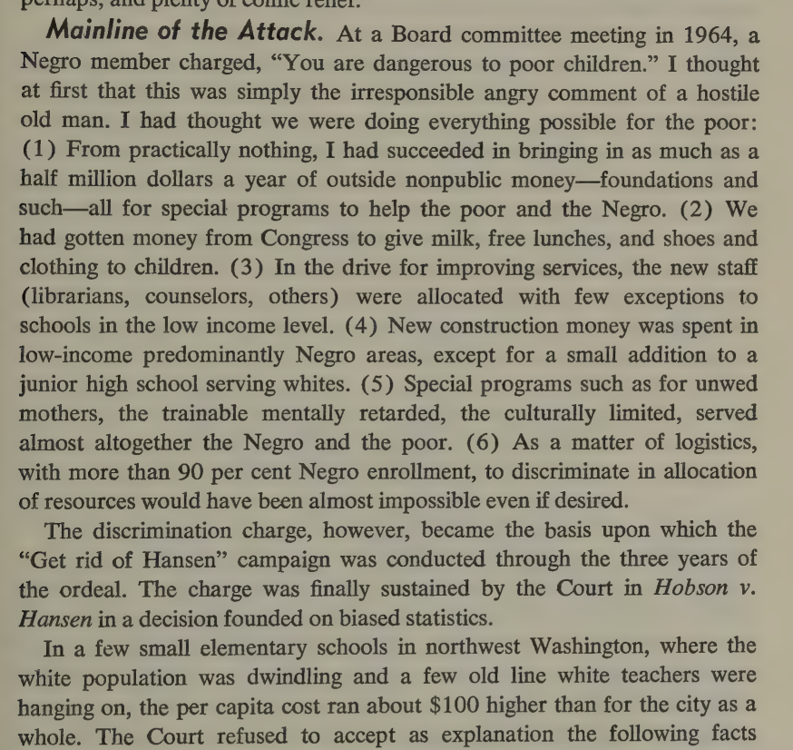 The author was eventually forced out of his position when he lost a court case alleging he had discriminated against the poor and Negros in allocation of resources (not true, as with analogous cases today) and the Board of Education forbade him from appealing.