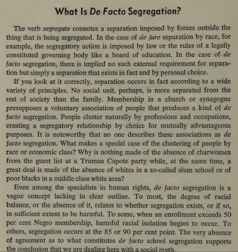 Hansen strongly opposed bussing. De jure segregation was evil, but he argues de facto segregation is a destructive anti-concept. After all, any group of freely-associating individuals will not be totally representative, and it would be tyrannical to force them all to conform.