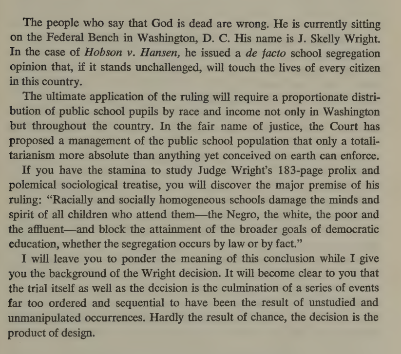 The Civil Rights kritarchy. Federal judge Wright ruling that it every school in the country needs to have a proportionate distribution of pupils by race and income, on the grounds that "racially and socially homogenous schools damage the minds" of children who attend them.