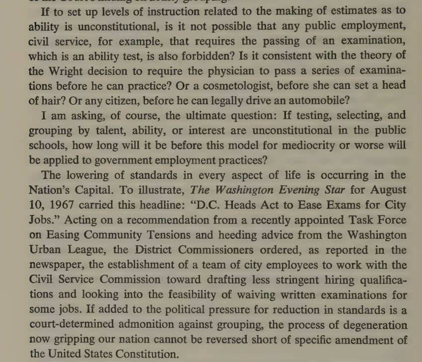 The reductio ad absurdum of the Wright ruling: it would appear to ban not just homogenous schools of any sort and ability tracking, but *all* forms of testing, selecting, or grouping by talent/ability/interest. Which is of course exactly what happened.