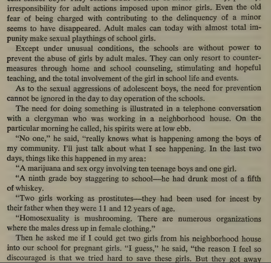 On the decline of monogamy and the Sexual Revolution among students, with many getting pregnant. Prostitution, incest, abuse by older men, homosexuality. Negro girls cornering one of the few white ones and carving the word "slut" into her arm.