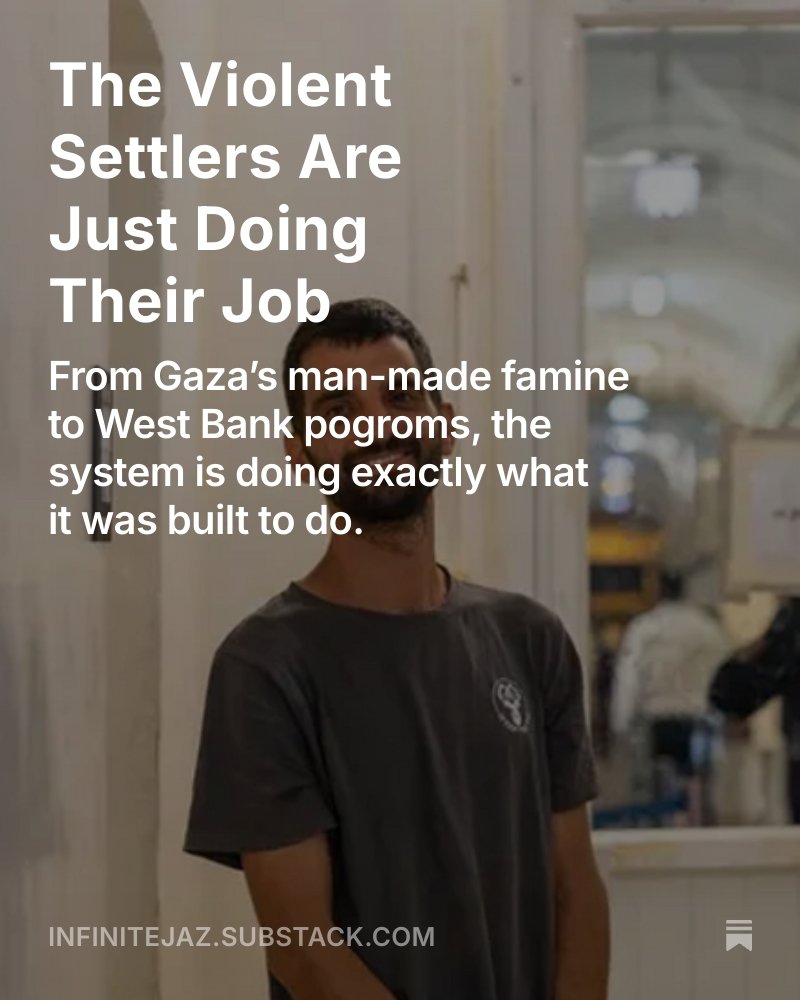 They’ve got it down to a system—build outpost, attack, seize land—and it’s why gov't leaders call these settlers “Jewish heroes & pioneers.” They’re on the front lines, expanding Israel’s borders. Read here: “The Violent Settlers Are Just Doing Their Job.” infinitejaz.substack.com/p/the-violent-…