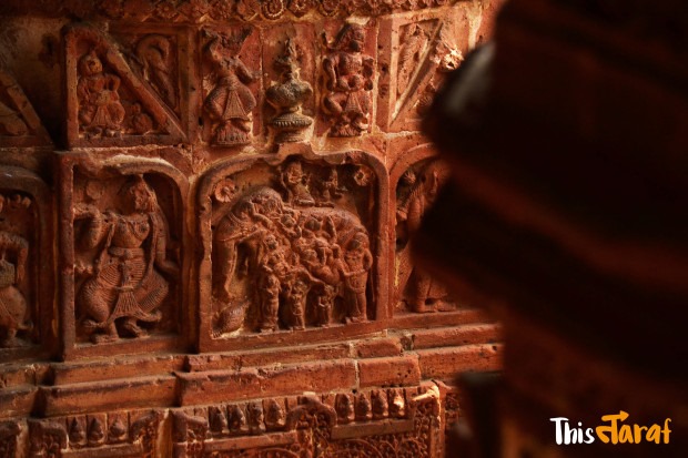 The Singha rulers of Malla regarded Madanmohan Jeu as their presiding deity, whose shrine is still a terracotta architectural marvel. Gopal Singha, the descendant at the time, in 1742 faced a blow when a Bargi army of fifty two thousand attacked Bishnupur including tthe temple.