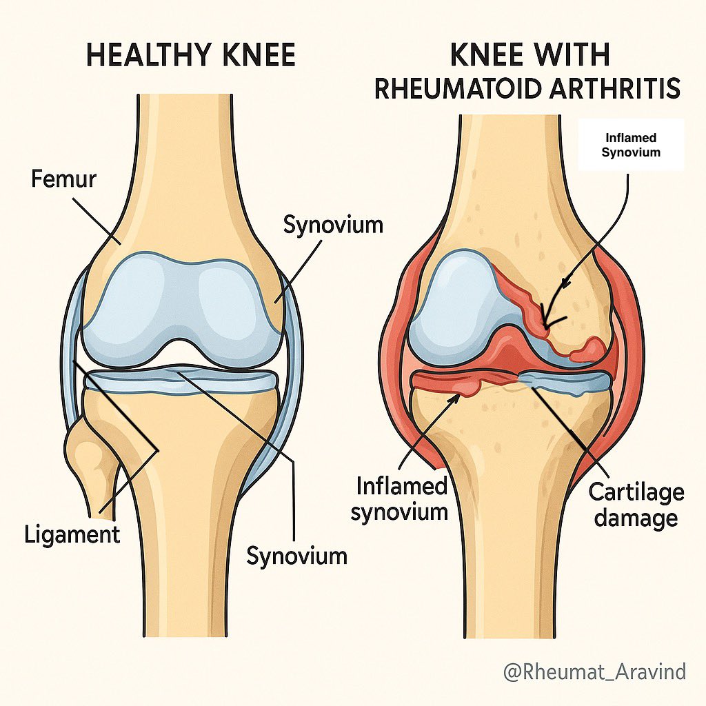 🔸 RA knees show swelling, inflamed synovium (the joint lining), and bone erosion—key targets for early intervention!