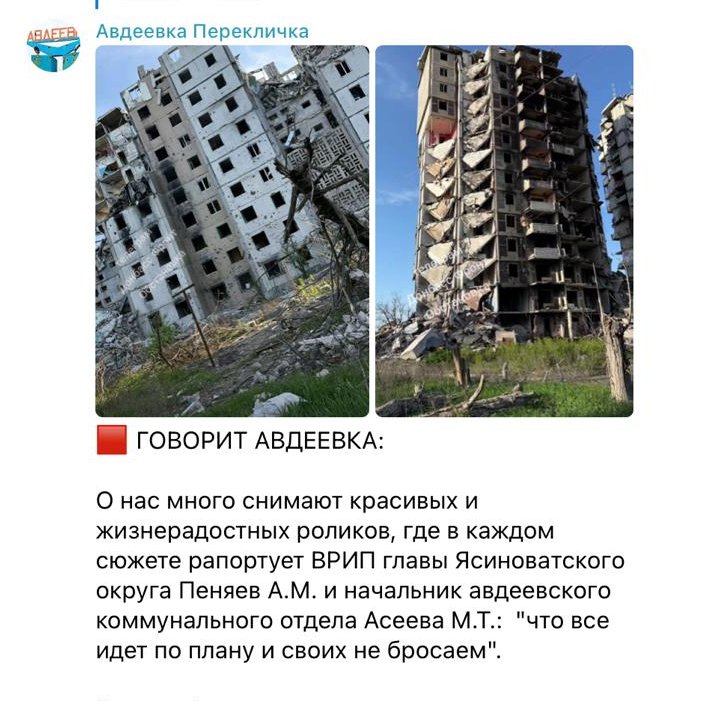 4/ "They shoot a lot of beautiful and cheerful videos about us, where in each story the acting head of the Yasynuvata district A.M. Penyaev and the head of the Avdiivka communal department M.T. Aseeva report: "that everything is going according to plan…