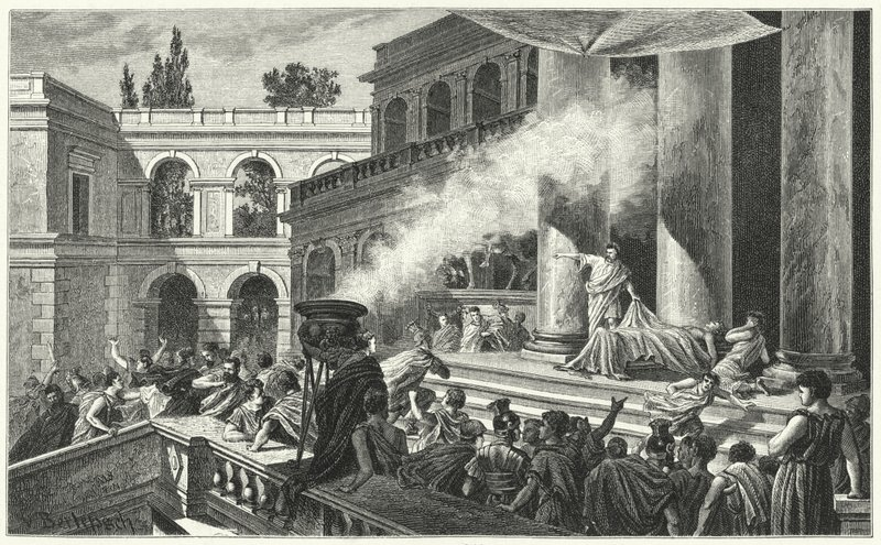 The conspirators crowded around him under the pretence of presenting a petition. One of them, Tillius Cimber, pulled Caesar's toga from his shoulders. It was the signal. The daggers came out.