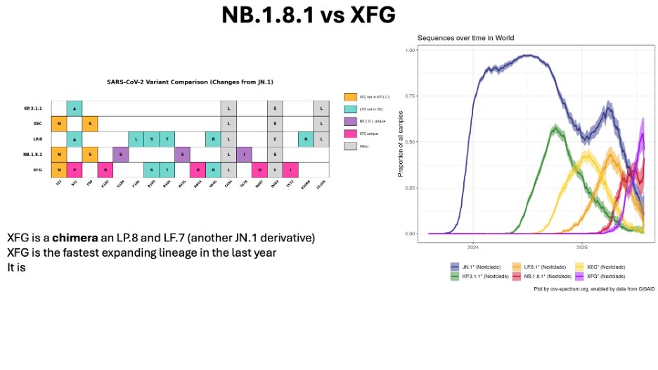 Finally, that brings us to XFG. XFG is a recombinant between LP.8.1 and another JN.1. XFG expanded more rapidly than most of the others, and is the first lineage to reach world dominance (it seems) in a year.