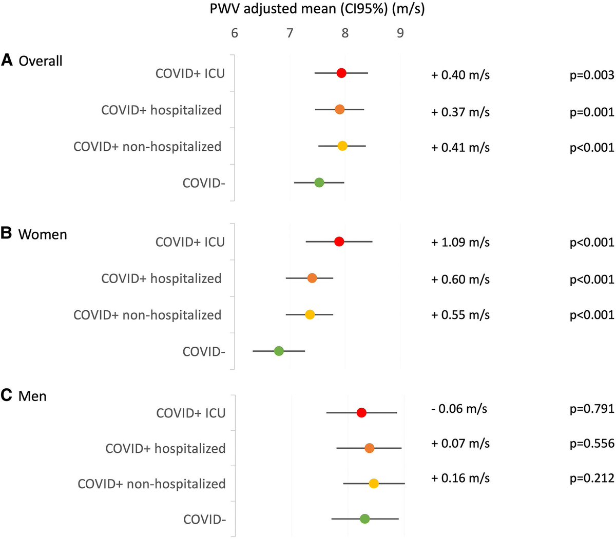 The average increase in PWV in women who had mild COVID was 0.55 meters per second, 0.60 in women hospitalized with COVID, and 1.09 for women treated in intensive care.