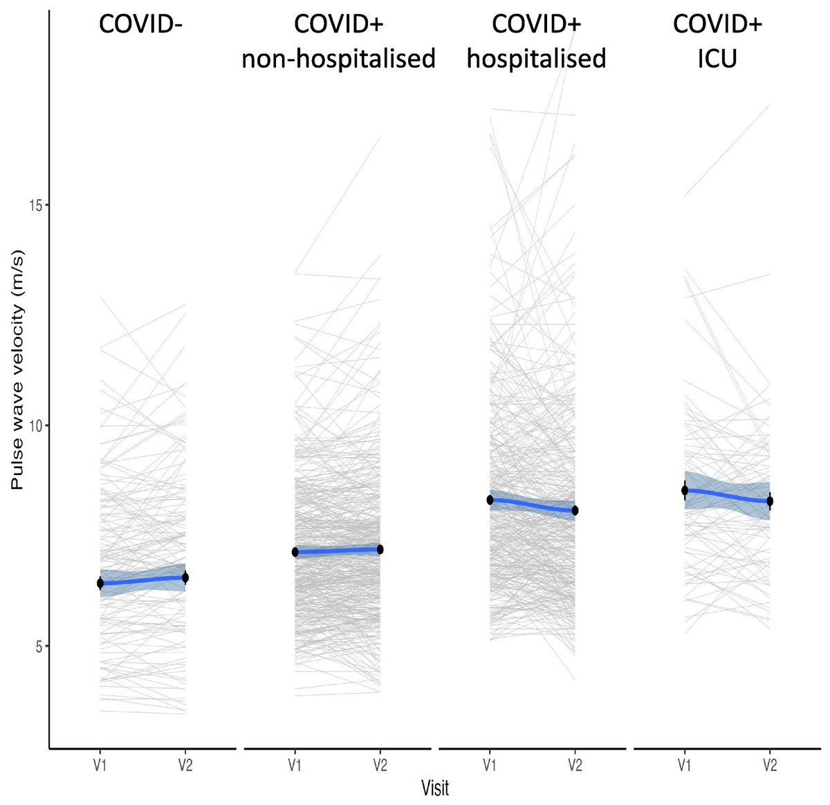 The higher this measurement, the stiffer the blood vessels and the higher the vascular age of a person. Measurements were taken six months after COVID infection and again after 12 months. 5/