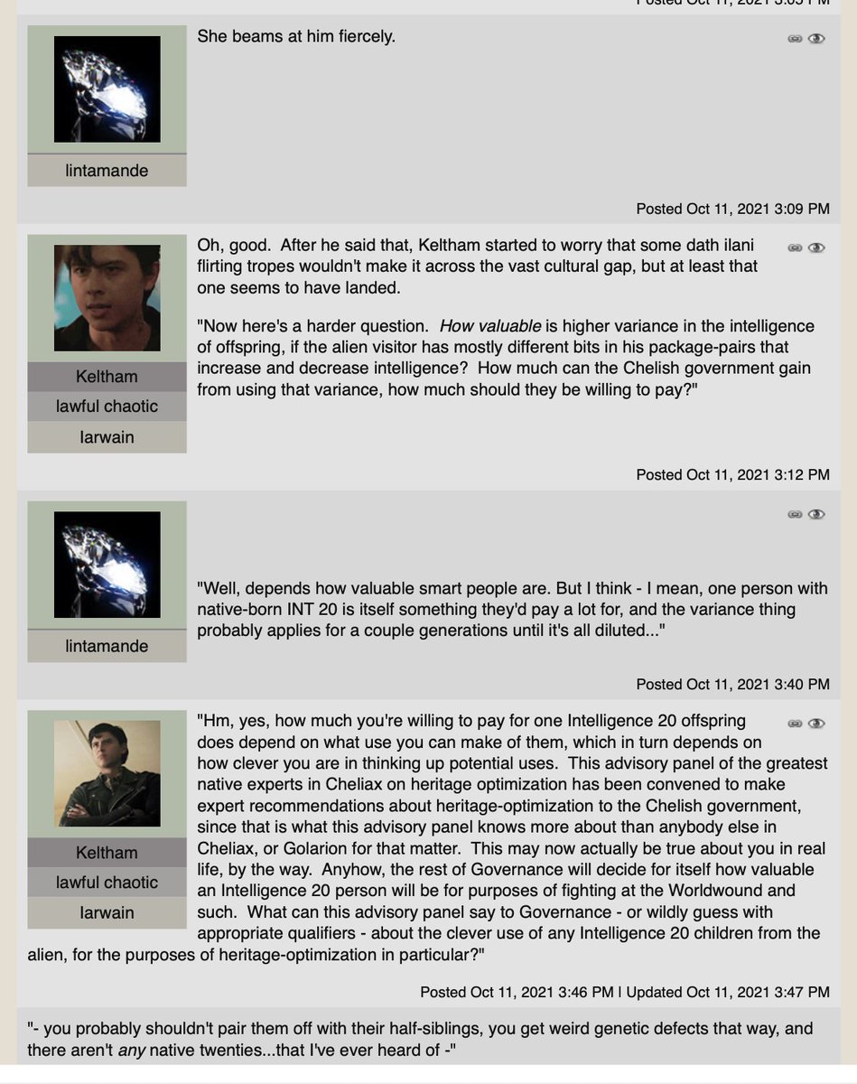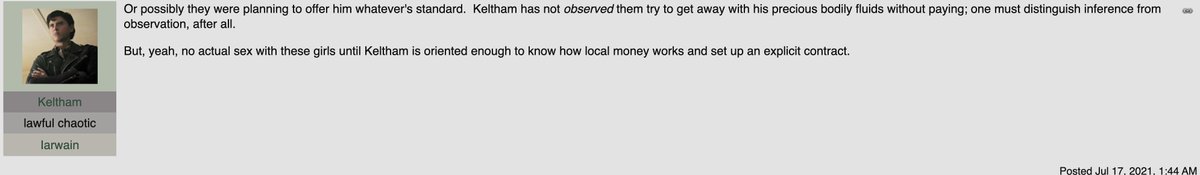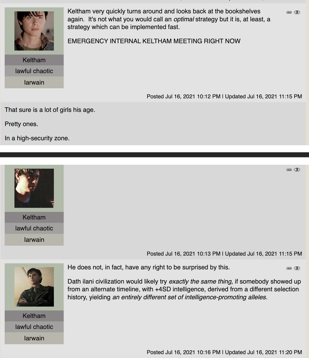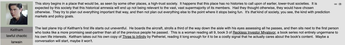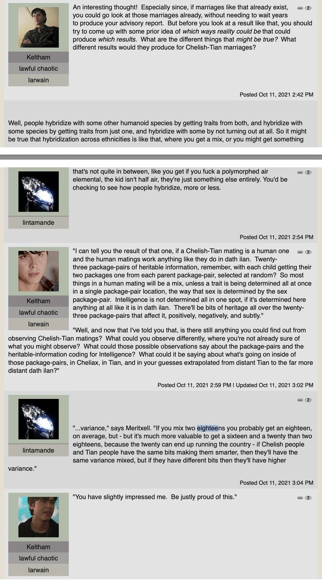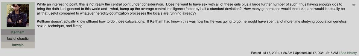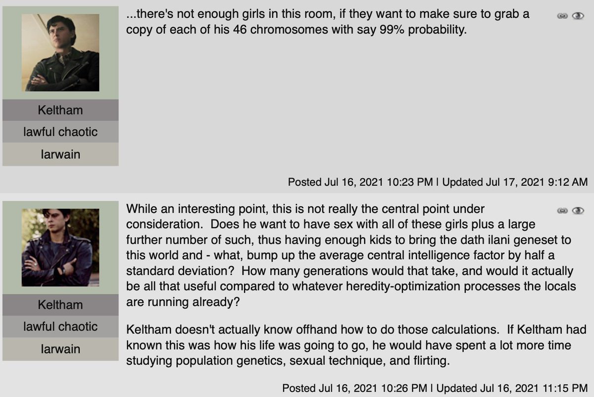 i forgot to point out that Yudkowsky's self-insert character in this is a teenager. who is being horny for doing eugenics with other teenagers while being paid for his high IQ sperm in true libertarian fashion
