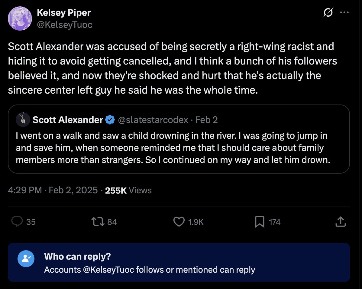 coincidentally, here's Kelsey Piper defending Scott Alexander and claiming he's not a racist earlier this year!