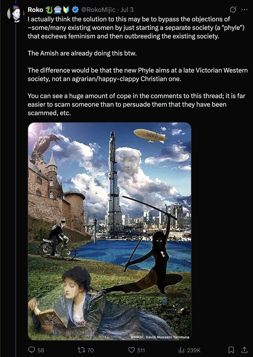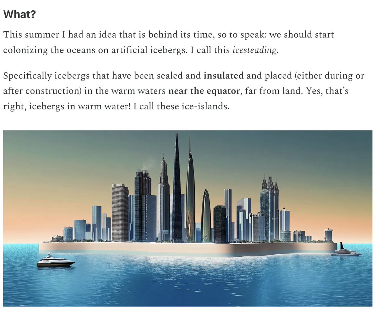 other cool Roko ideas are "bypassing the objections of many existing women" to outbreed feminists (more weird eugenics type stuff) and colonizing icebergs for AI server farms
