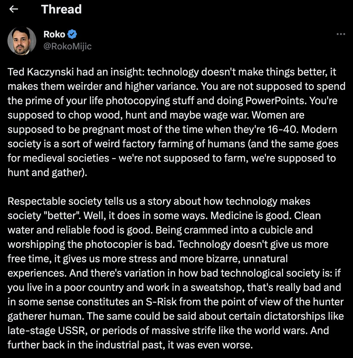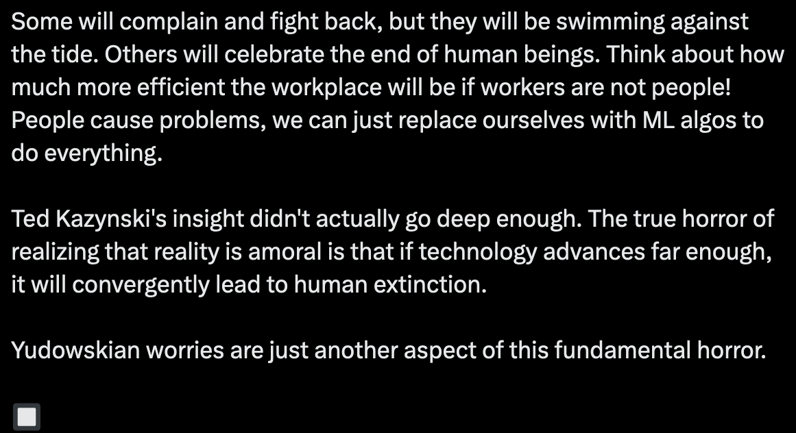 takes like "Ted Kaczynsky had an insight". and transgender Great Replacement theory
