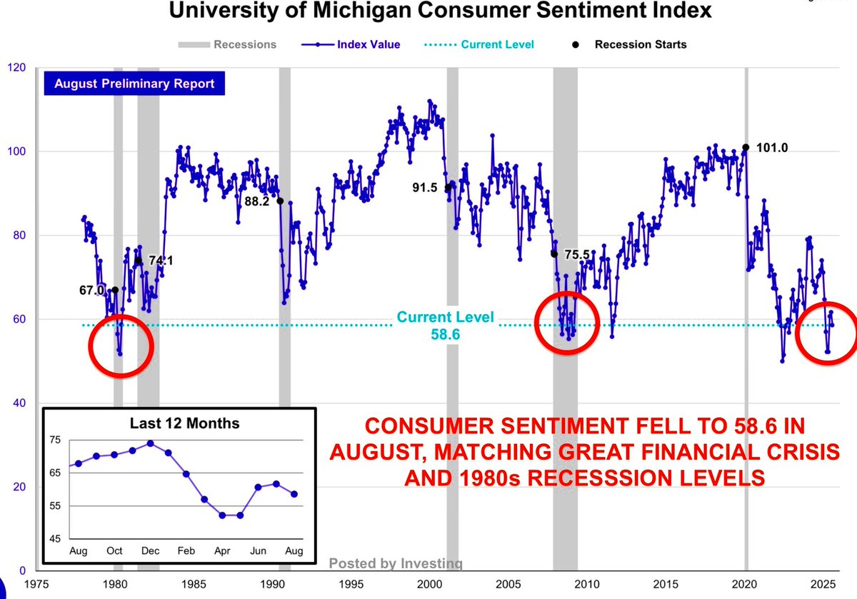 The Michigan Sentiment Index sank to 58.6 in August, levels not seen outside deep downturns.