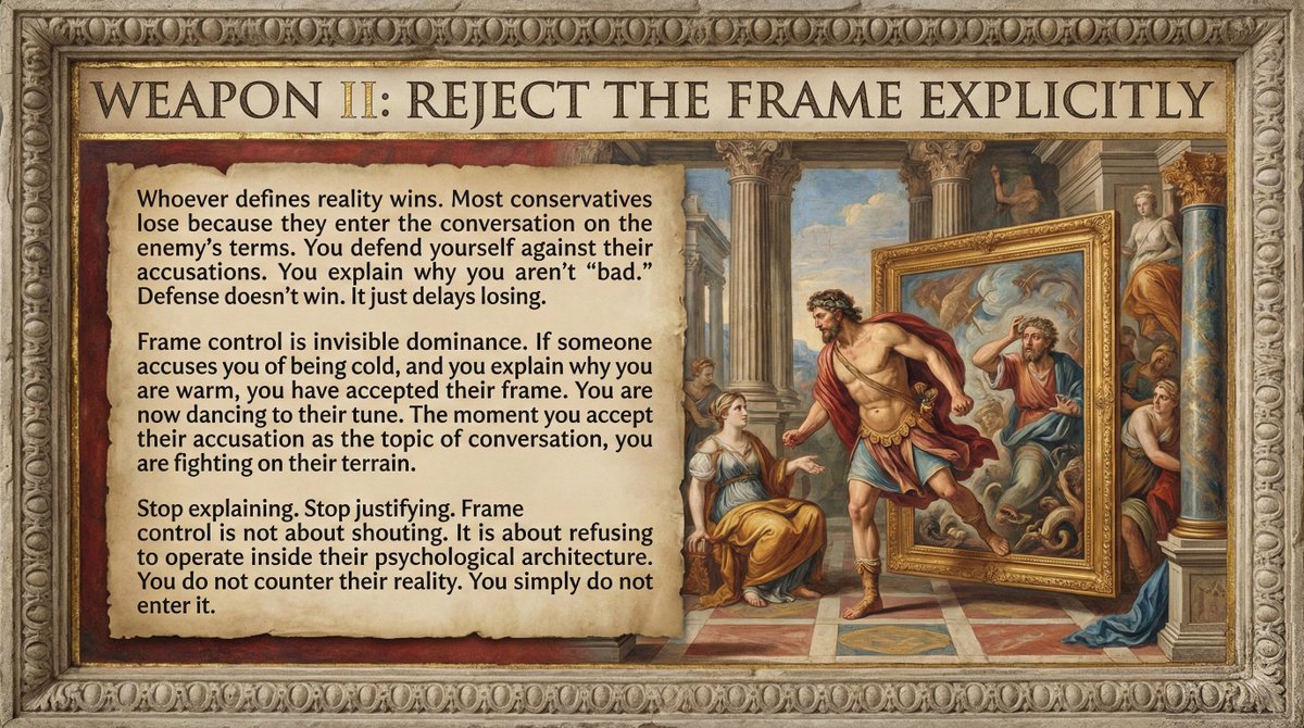 Frame control is invisible dominance. If someone accuses you of being cold, and you explain why you are warm, you have accepted their frame. You are now dancing to their tune. The moment you accept their accusation as the topic of conversation, you are fighting on their terrain. Stop explaining. Stop justifying. Frame control is not about shouting. It is about refusing to operate inside their psychological architecture. You do not counter their reality. You simply do not enter it.