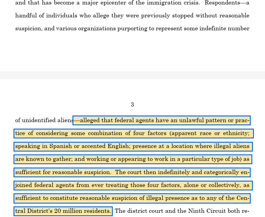 Here, the district court forbade ICE Agents working in greater Los Angeles from considering four extremely broad attributes in forming suspicions about potential illegal aliens. As @TheJusticeDept explains below. 3/