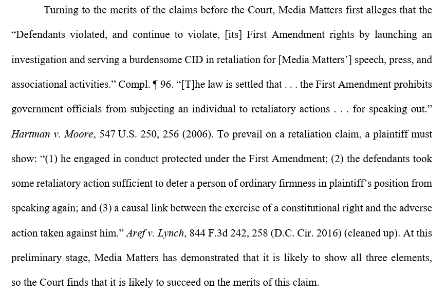 Back to this case. Media Matters--like any investigative target--does not want to be investigated. So it sued in DDC to enjoin the *investigation itself.* Media Matters says it has a First Amendment right to not be investigated *at all.* 5/
