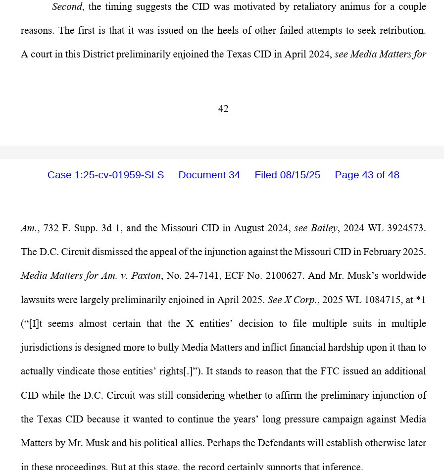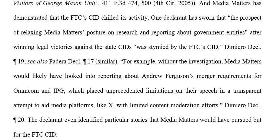 The district court agreed. The gist of Judge Sooknanan's opinion is that because certain @FTC officials expressed views that the alleged boycott is serious and that Media Matters engages in poor behavior, they are constitutionally foreclosed from conducting an investigation. 6/