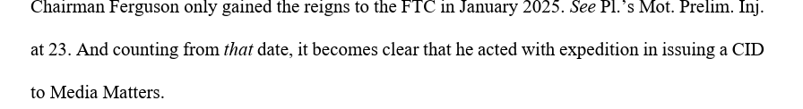 The Judge also claims that the timing of the CID suggests it is about retaliating for speech rather than enforcing the antitrust laws. That doesn't make much sense, since @AFergusonFTC has only been the Chairman since January; when else would this investigation have begun? 11/