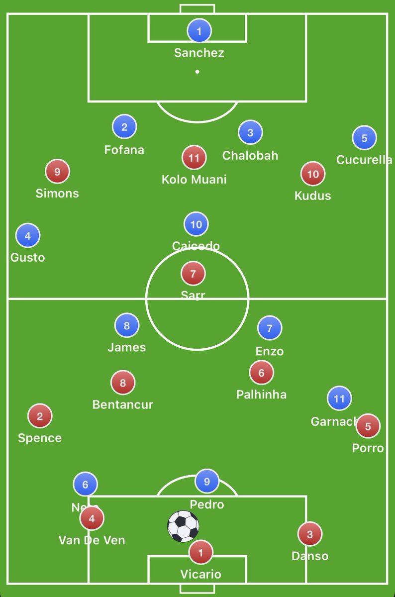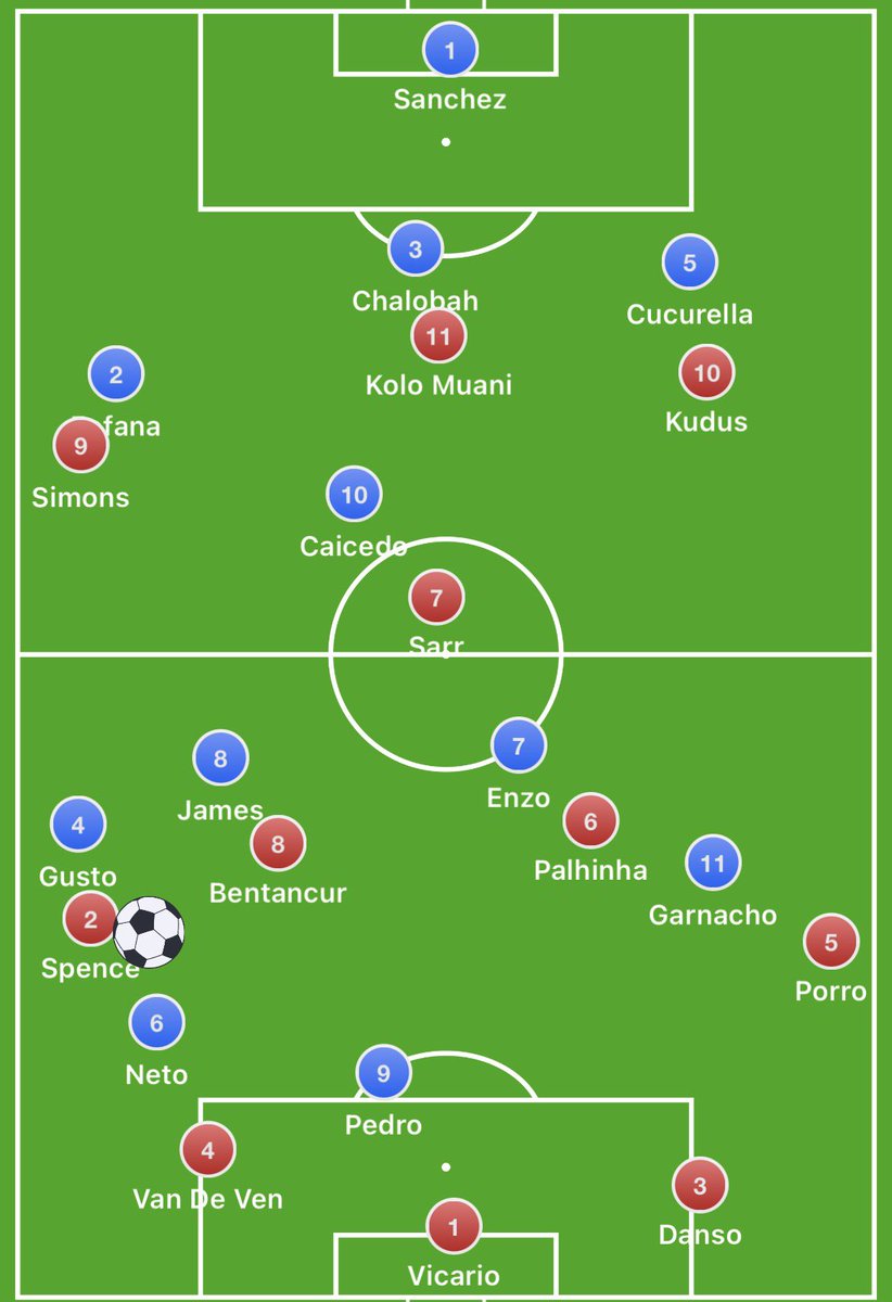 It doesn’t suit Cucurella (could he move into the half spaces?) & Maresca still clearly doesn’t trust the fitness of James going forward, maybe could use Gusto, Palmer on the wing & Simons 10 if he joins?