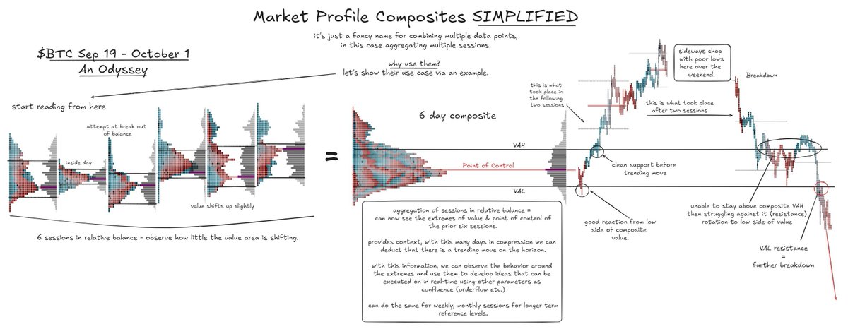 1. consecutive days with value shifting lower (little to no over lap) into a few tight sessions sideways.