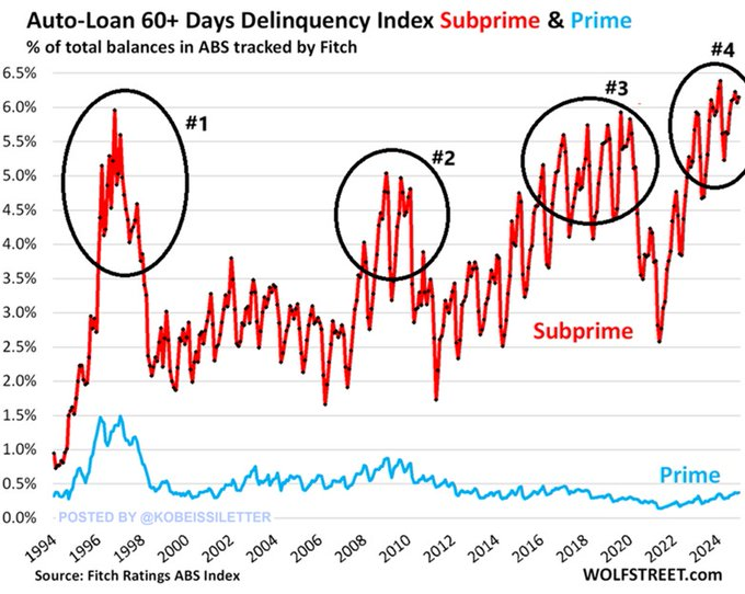 US subprime auto loan 60+ day delinquency rates jumped to 6.2% in December 2024.