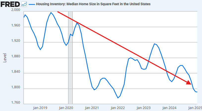 The median home size in the US fell to 1,792 sq feet in January 2025.