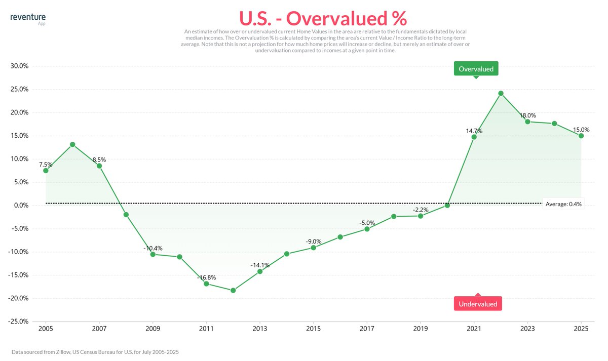 3) Home values in the U.S. are 15% overvalued today compared to their historical norms relative to income.