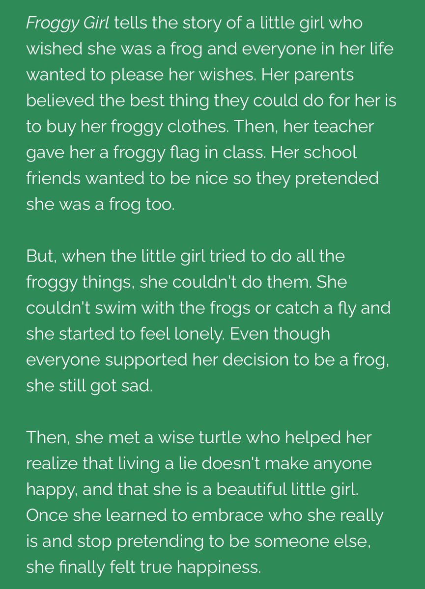 Froggy Girl was illustrated by @nicolasblooms. Nicolas and I were part of the group who went to speak with doctors at the American Academy of Pediatrics conference about the harms of cross-sex hormones and surgeries. On the third day, they kicked us out with no explanation. I’m behind the camera in this video. Nicolas stated, “We matter, our voices matter and our health matters.”
