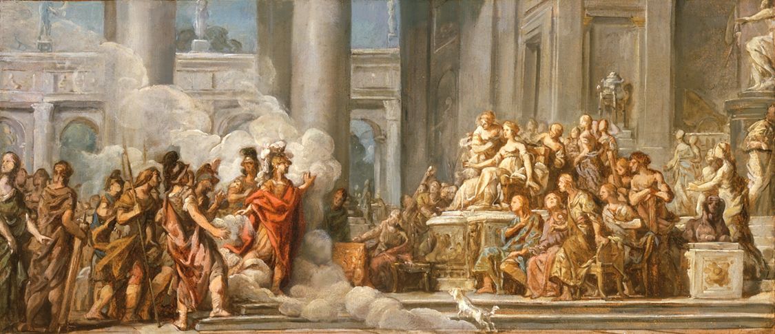 In the scene, the future king Ascanius requests Jupiter’s aid in defeating the native Italians in order to found the Italian nation, pleading “Favor my endeavors, Jupiter.”