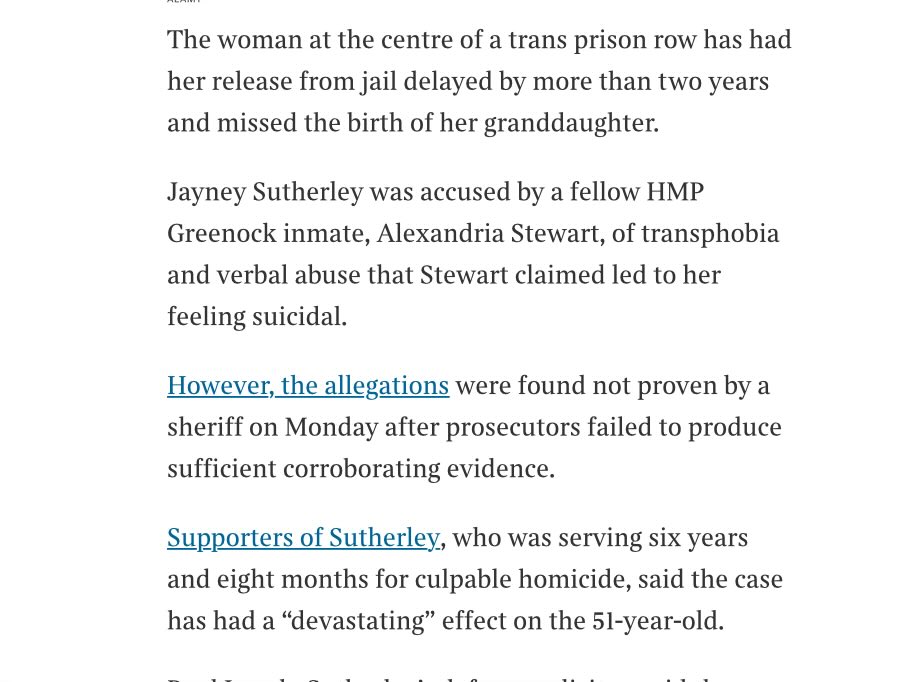 Good to see Janey Sutherley getting this attention. It took two years to clear her, in court, of criminal charges. She had refused to say that a man with whom she was imprisoned under Sturgeon’s self-ID policies, was a woman. She lost parole while awaiting trial.