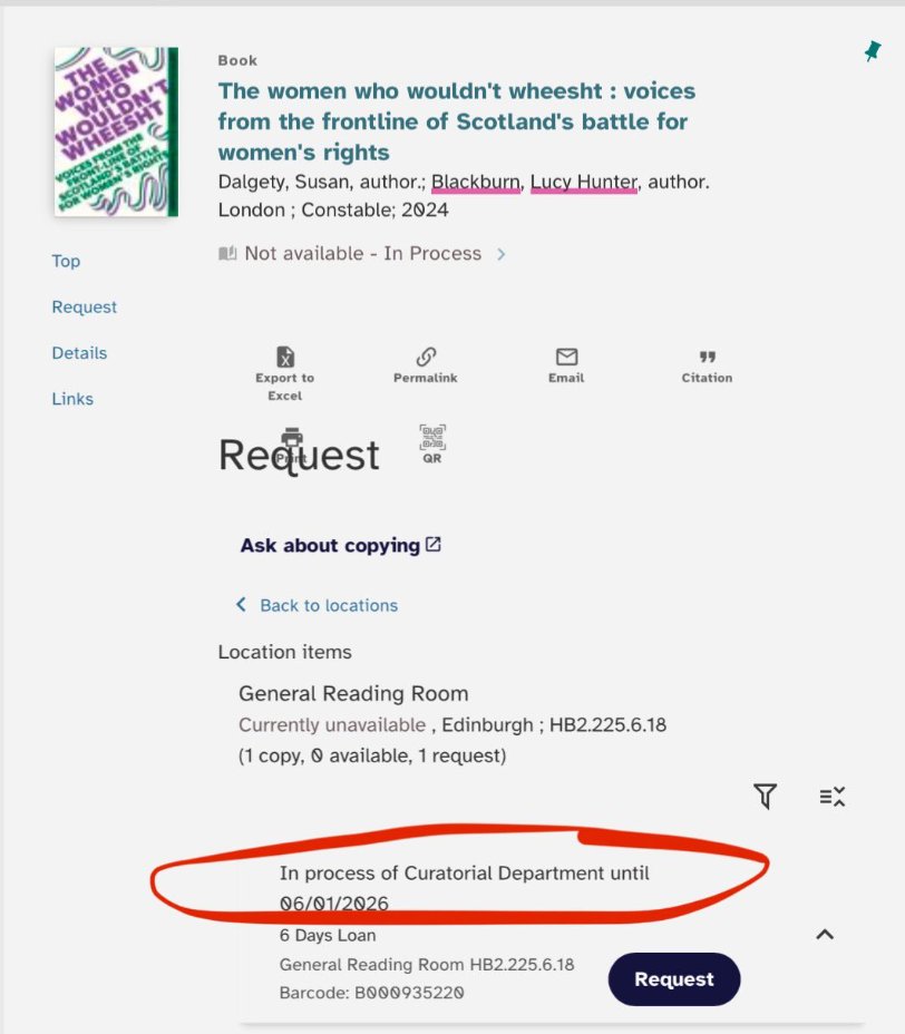 By the end of Thursday, it was still "not available", but now due to being "on loan" for 6 days until....13 September. (The NLS doesn't lend out books to readers, so not clear what this tells us.)/