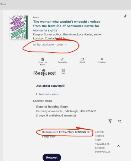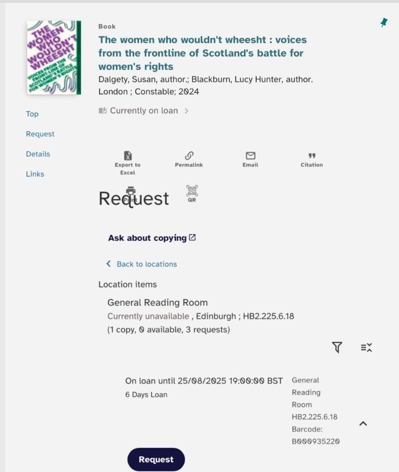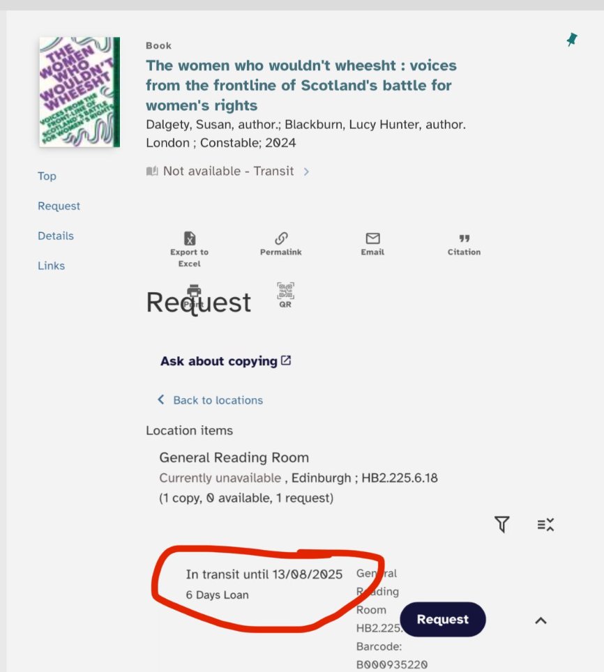 First thing on Wednesday 13 August, a regular library user (h/t @staylorish) tried to order the book through the online system. At this point, the NLS system was saying the book was not available, and would not be, until...