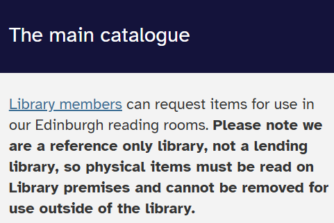 Background: NLS is one of the UK's copyright libraries. Publishers are obliged to lodge books they publish with this network. NLS's large physical collection is mostly kept in stacks, and most items have to be ordered up to the reading room./